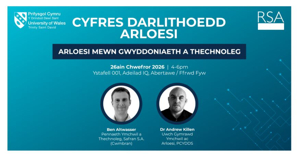 Mae Prifysgol Cymru Y Drindod Dewi Sant (UWTSD), mewn cydweithrediad â’r Royal Society of Arts (RSA), yn falch o gyhoeddi’r ail ddigwyddiad yn ei gyfres newydd o Ddarlithoedd Arloesi ar gyfer blwyddyn academaidd 2025–2026. Bydd y ddarlith yn cael ei chynnal ar 26 Ionawr 2026 rhwng 4pm a 6pm, ar gampws Glan Abertawe’r Brifysgol yn Adeilad IQ, gyda’r opsiwn o wylio’n fyw ar-lein ar gael i gynulleidfaoedd ehangach.